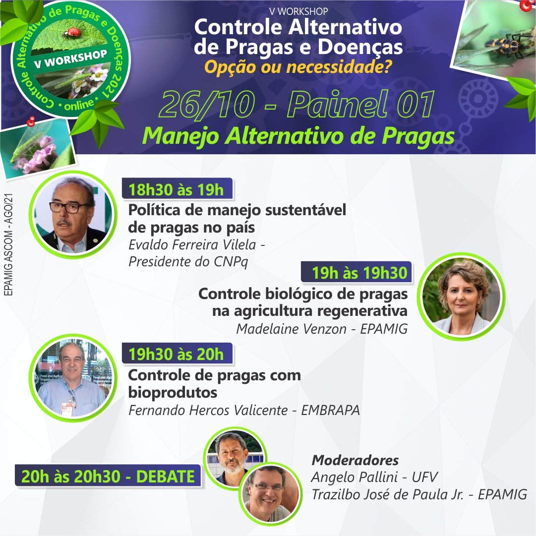 (Viçosa – 21/10/2021) – O 5º. Workshop Controle Alternativo de Pragas e Doenças, promovido pela Empresa de Pesquisa Agropecuária de Minas Gerais (EPAMIG) em parceria com a Universidade Federal de Viçosa (UFV), acontece na próxima semana, entre os dias 26 e 28 de outubro. As atividades serão online e gratuitas e os interessados podem se inscrever pelo site www.controlealternativo.com.br.